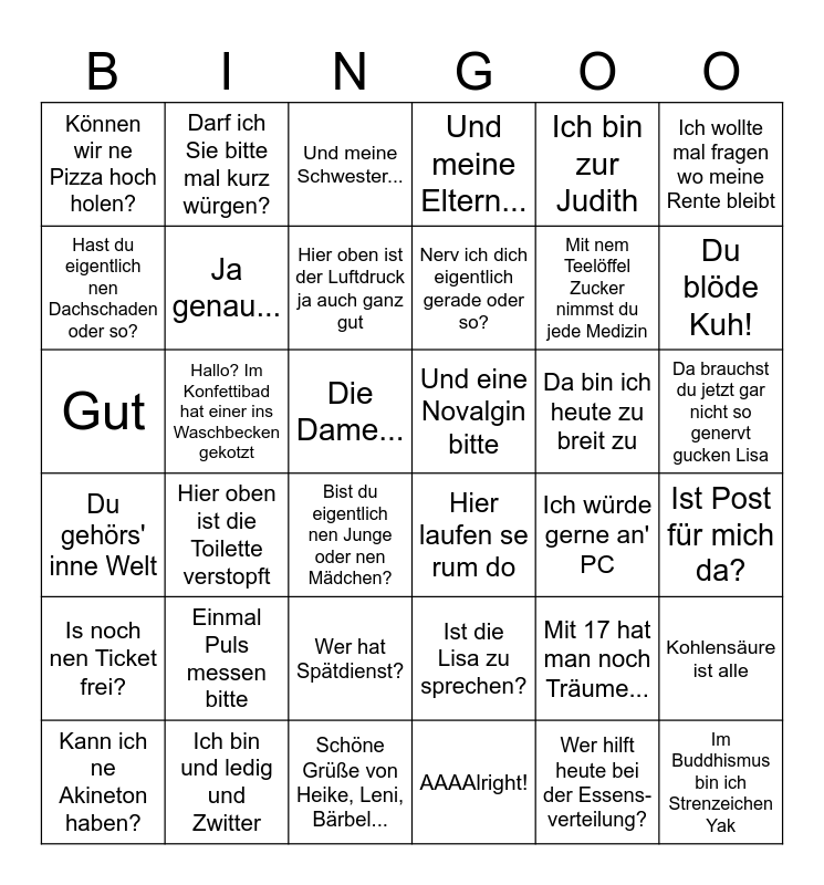 This bingo card has 36 words: Ist die Lisa zu sprechen?, Wer hat Spätdienst?, AAAAlright!, Hast du eigentlich nen Dachschaden oder so?, Du gehörs' inne Welt, Und eine Novalgin bitte, Ja genau..., Schöne Grüße von Heike, Leni, Bärbel..., Ich bin zur Judith, Mit 17 hat man noch Träume..., Du blöde Kuh!, Und meine Eltern..., Kohlensäure ist alle, Hallo? Im Konfettibad hat einer ins Waschbecken gekotzt, Nerv ich dich eigentlich gerade oder so?, Können wir ne Pizza hoch holen?, Is noch nen Ticket frei?, Da bin ich heute zu breit zu, Gut, Und meine Schwester..., Die Dame..., Hier oben ist die Toilette verstopft, Hier laufen se rum do, Bist du eigentlich nen Junge oder nen Mädchen?, Ich würde gerne an' PC, Darf ich Sie bitte mal kurz würgen?, Mit nem Teelöffel Zucker nimmst du jede Medizin, Ich bin und ledig und Zwitter, Hier oben ist der Luftdruck ja auch ganz gut, Ich wollte mal fragen wo meine Rente bleibt, Im Buddhismus bin ich Strenzeichen Yak, Kann ich ne Akineton haben?, Ist Post für mich da?, Da brauchst du jetzt gar nicht so genervt gucken Lisa, Einmal Puls messen bitte and Wer hilft heute bei der Essens-verteilung?.