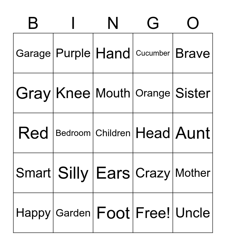 This bingo card has 30 words: Garden, Office, Bedroom, Dining room, Garage, Hand, Knee, Ears, Head, Foot, Aunt, Children, Free!, Uncle, Sister, Shy, Crazy, Smart, Silly, Brave, Red, Green, Purple, Orange, Gray, Cucumber, Mother, Happy, Mouth and Bathroom.