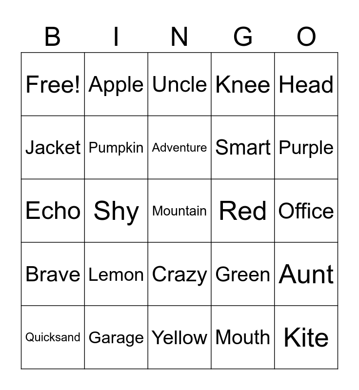 This bingo card has 70 words: Garden, Office, Bedroom, Dining room, Garage, Hand, Knee, Ears, Head, Foot, Aunt, Children, Free!, Uncle, Sister, Shy, Crazy, Smart, Silly, Brave, Red, Green, Purple, Orange, Gray, Cucumber, Mother, Happy, Mouth, Bathroom, Apple, Balloon, Castle, Dolphin, Elephant, Forest, Garden, Honey, Island, Jacket, Kite, Lemon, Mountain, Necklace, Ocean, Pumpkin, Quicksand, Rainbow, Sunflower, Treasure, Universe, Victory, Waterfall, Xylophone, Yellow, Zebra, Adventure, Butterfly, Compass, Diamond, Echo, Feather, Galaxy, Horizon, Imagine, Journey, Knowledge, Lighthouse, Mystery and Notebook.