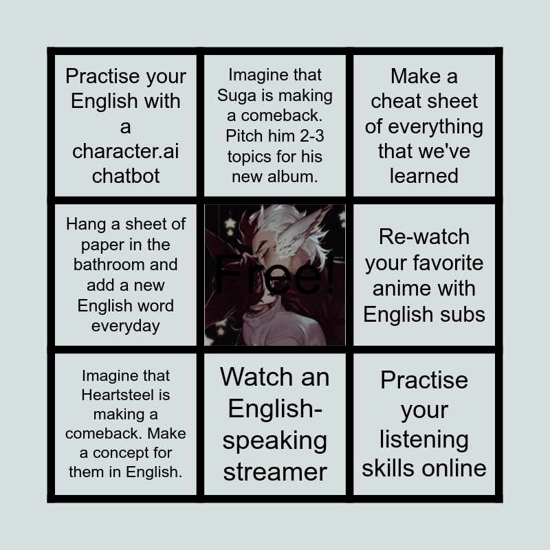 This bingo card has a free space and 8 words: Re-watch your favorite anime with English subs, Make a cheat sheet of everything that we've learned, Imagine that Suga is making a comeback. Pitch him 2-3 topics for his new album., Imagine that Heartsteel is making a comeback. Make a concept for them in English., Practise your English with a character.ai chatbot, Practise your listening skills online, Hang a sheet of paper in the bathroom and add a new English word everyday and Watch an English-speaking streamer.