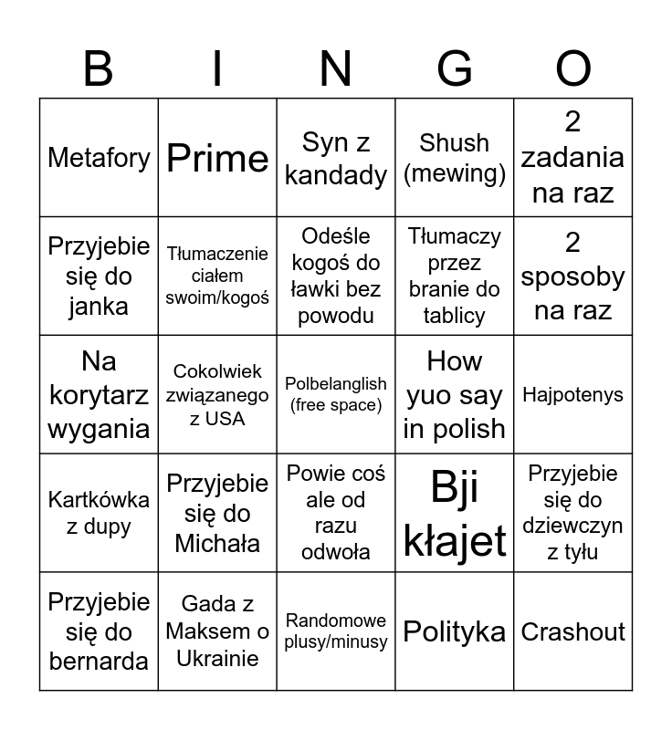This bingo card has a free space and 24 words: Przyjebie się do bernarda, Przyjebie się do Michała, Odeśle kogoś do ławki bez powodu, Polityka, 2 zadania na raz, Metafory, Prime, Syn z kandady, How yuo say in polish, Hajpotenys, Na korytarz wygania, Tłumaczenie ciałem swoim/kogoś, Bji kłajet, Przyjebie się do dziewczyn z tyłu, Przyjebie się do janka, Gada z Maksem o Ukrainie, Randomowe plusy/minusy, Shush (mewing), 2 sposoby na raz, Kartkówka z dupy, Cokolwiek związanego z USA, Powie coś ale od razu odwoła, Tłumaczy przez branie do tablicy and Crashout.