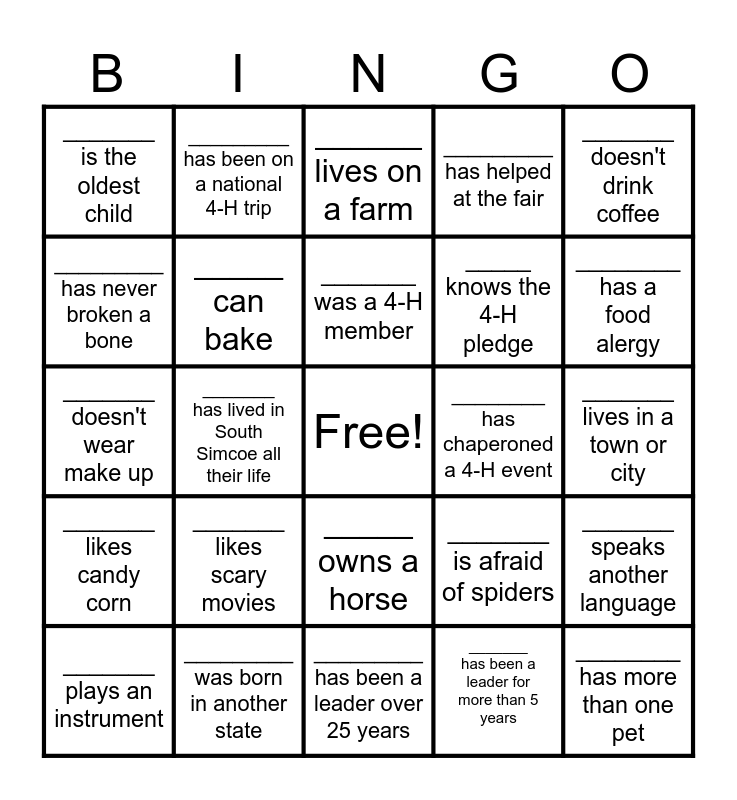 This bingo card has a free space and 24 words: _______ plays an instrument, _______ likes scary movies, _______ was a 4-H member, _______ has been a leader for more than 5 years, _______ doesn't drink coffee, _______ is the oldest child, _________ has been on a national 4-H trip, ______ lives on a farm, ________ has chaperoned a 4-H event, _______ lives in a town or city, _______ doesn't wear make up, _____ can bake, _______ is afraid of spiders, _______ speaks another language, _________ has never broken a bone, _________ was born in another state, _________ has been a leader over 25 years, _________ has helped at the fair, ________ has a food alergy, _______ likes candy corn, _______ has lived in South Simcoe all their life, _____ owns a horse, _____ knows the 4-H pledge and ________ has more than one pet.
