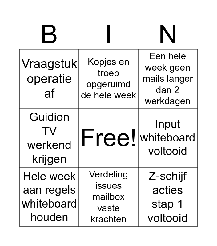 This bingo card has a free space and 8 words: Input whiteboard voltooid, Een hele week geen mails langer dan 2 werkdagen, Kopjes en troep opgeruimd de hele week, Hele week aan regels whiteboard houden, Vraagstuk operatie af, Z-schijf acties stap 1 voltooid, Guidion TV werkend krijgen and Verdeling issues mailbox vaste krachten.