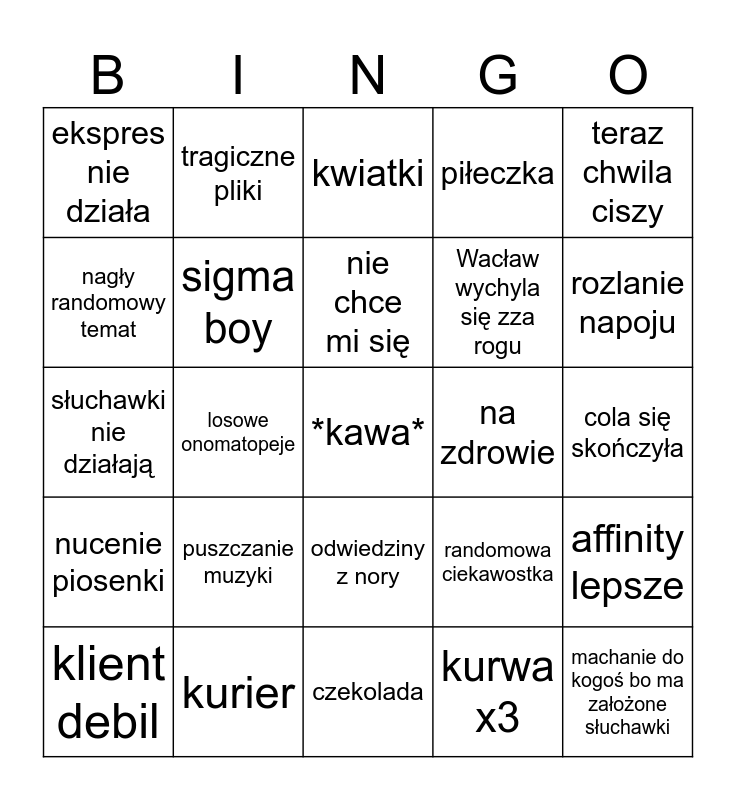 This bingo card has a free space and 34 words: siema, kurwa x3, ja pierdole, a co ja robiłam/em?, nucenie piosenki, sigma boy, teraz chwila ciszy, klient debil, tragiczne pliki, siesta po obiedzie, nie chce mi się, kwiatki, idę się przejść, kiedy obiad?, na zdrowie, rozlanie napoju, kurier, słuchawki nie działają, puszczanie muzyki, randomowa ciekawostka, odwiedziny z nory, cały pokój w biurze, ekspres nie działa, cola się skończyła, czekolada, machanie do kogoś bo ma założone słuchawki, piłeczka, ale to jest brzydkie, Wacław wychyla się zza rogu, nagły randomowy temat, *zdejmuje słuchawki* "co?", losowe onomatopeje, affinity lepsze and zamykanie drzwi.
