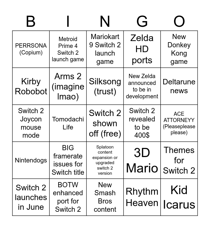 This bingo card has a free space and 24 words: BIG framerate issues for Switch title, BOTW enhanced port for Switch 2, Silksong (trust), Switch 2 launches in June, New Donkey Kong game, PERRSONA (Copium), Kirby Robobot, Metroid Prime 4 Switch 2 launch game, Switch 2 revealed to be 400$, Splatoon content expansion or upgraded switch 2 version, New Zelda announced to be in development, Switch 2 Joycon mouse mode, 3D Mario, Themes for Switch 2, Arms 2 (imagine lmao), Rhythm Heaven, ACE ATTORNEYY (Pleaseplease please), Mariokart 9 Switch 2 launch game, Deltarune news, Tomodachi Life, Kid Icarus, Nintendogs, Zelda HD ports and New Smash Bros content.