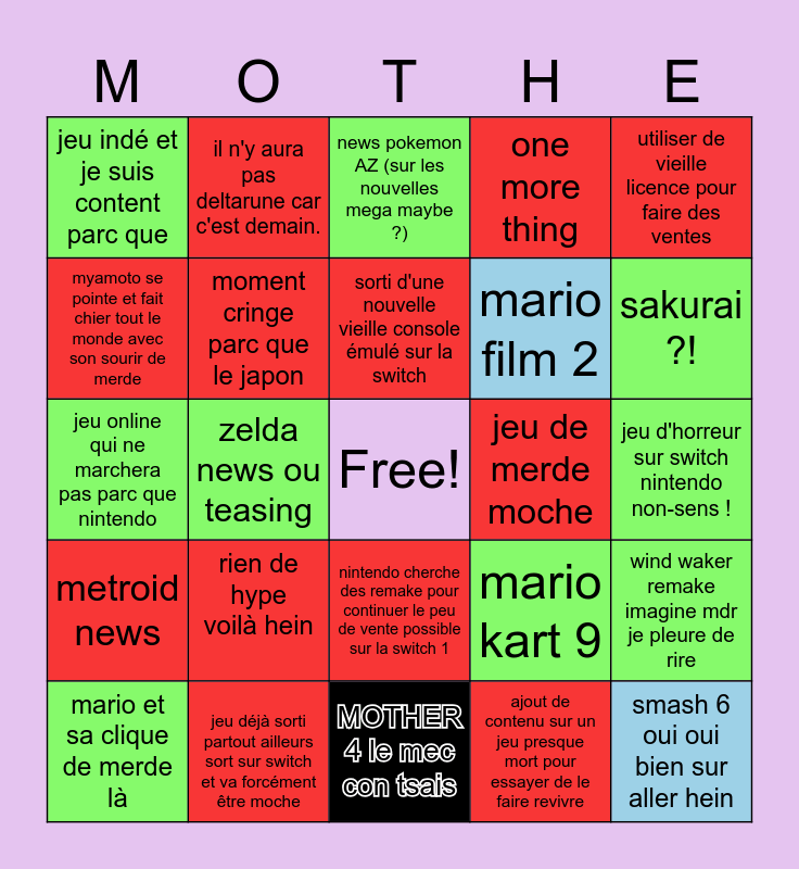 This bingo card has a free space and 24 words: rien de hype voilà hein, jeu déjà sorti partout ailleurs sort sur switch et va forcément être moche, sorti d'une nouvelle vieille console émulé sur la switch, mario et sa clique de merde là, utiliser de vieille licence pour faire des ventes, jeu indé et je suis content parc que, myamoto se pointe et fait chier tout le monde avec son sourir de merde, il n'y aura pas deltarune car c'est demain., jeu de merde moche, nintendo cherche des remake pour continuer le peu de vente possible sur la switch 1, mario film 2, jeu online qui ne marchera pas parc que nintendo, mario kart 9, wind waker remake imagine mdr je pleure de rire, moment cringe parc que le japon, ajout de contenu sur un jeu presque mort pour essayer de le faire revivre, jeu d'horreur sur switch nintendo non-sens !, news pokemon AZ (sur les nouvelles mega maybe ?), sakurai ?!, zelda news ou teasing, smash 6 oui oui bien sur aller hein, metroid news, one more thing and MOTHER 4 le mec con tsais.