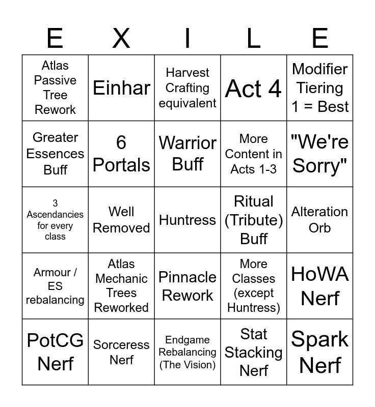 This bingo card has a free space and 24 words: Atlas Mechanic Trees Reworked, Sorceress Nerf, Warrior Buff, PotCG Nerf, Modifier Tiering 1 = Best, Atlas Passive Tree Rework, Greater Essences Buff, Einhar, Ritual (Tribute) Buff, Pinnacle Rework, More Content in Acts 1-3, 3 Ascendancies for every class, More Classes (except Huntress), HoWA Nerf, 6 Portals, Stat Stacking Nerf, Alteration Orb, Harvest Crafting equivalent, "We're Sorry", Well Removed, Spark Nerf, Armour / ES rebalancing, Act 4 and Endgame Rebalancing (The Vision).