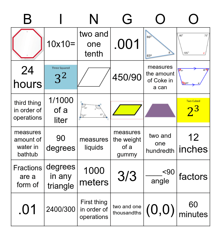 This bingo card has 18 images and 48 words: 90<___<180 angle, ____<90 angle, 180<___<360 angle, 90 degrees, degrees in any triangle, degrees in any quadrilateral, 10x10=, 10x10x10=, Free!, .001, .01, .1, (0,0), First thing in order of operations, second thing in order of operations, third thing in order of operations, last thing in order of operations, measures liquids, measure from city to city, measure the length of a penny, measures a droplet of water, measures amount of water in bathtub, measures the weight of a gummy, measures the length of a classroom, measures the amount of Coke in a can, 12 inches, 60 minutes, 24 hours, 1000 meters, 1/1000 of a liter, 3 feet, 2.2 pounds equal how many kilograms, 2400/300, 450/90, 35000/70, Fractions are a form of, 3/3, sum, quotient, product, difference, multiples, factors, prime, composite, two and one tenth, two and one hundredth and two and one thousandths.