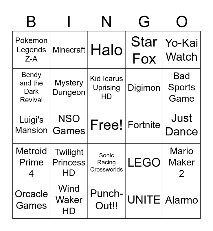 This bingo card has a free space and 24 words: Twilight Princess HD, Wind Waker HD, Kid Icarus Uprising HD, Orcacle Games, Yo-Kai Watch, Pokemon Legends Z-A, Bendy and the Dark Revival, Minecraft, Fortnite, Sonic Racing Crossworlds, Digimon, Luigi's Mansion, LEGO, Mario Maker 2, Mystery Dungeon, UNITE, Just Dance, Halo, Bad Sports Game, NSO Games, Alarmo, Metroid Prime 4, Star Fox and Punch-Out!!.