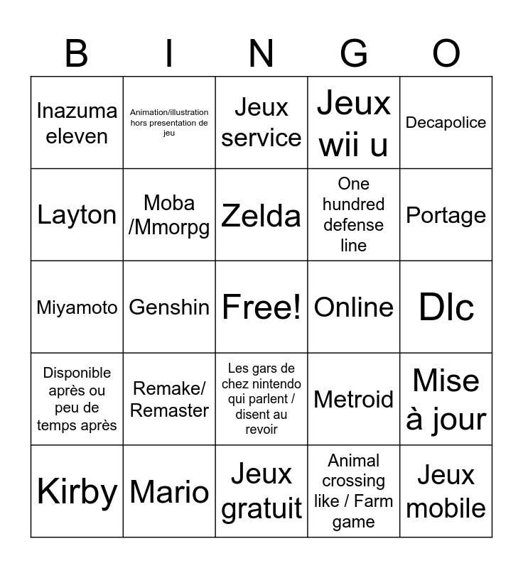 This bingo card has a free space and 24 words: Remake/ Remaster, Mario, Zelda, Kirby, Decapolice, Inazuma eleven, Layton, Animation/illustration hors presentation de jeu, Online, Les gars de chez nintendo qui parlent / disent au revoir, One hundred defense line, Miyamoto, Metroid, Mise à jour, Moba /Mmorpg, Animal crossing like / Farm game, Dlc, Jeux service, Portage, Genshin, Jeux mobile, Disponible après ou peu de temps après, Jeux wii u and Jeux gratuit.