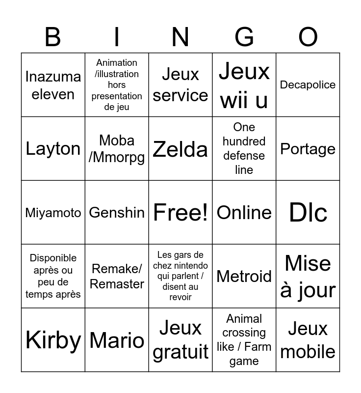This bingo card has a free space and 24 words: Remake/ Remaster, Mario, Zelda, Kirby, Decapolice, Inazuma eleven, Layton, Animation /illustration hors presentation de jeu, Online, Les gars de chez nintendo qui parlent / disent au revoir, One hundred defense line, Miyamoto, Metroid, Mise à jour, Moba /Mmorpg, Animal crossing like / Farm game, Dlc, Jeux service, Portage, Genshin, Jeux mobile, Disponible après ou peu de temps après, Jeux wii u and Jeux gratuit.