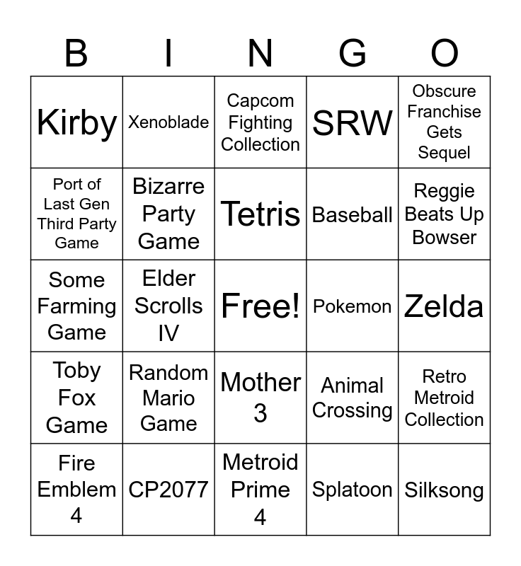 This bingo card has a free space and 24 words: Random Mario Game, CP2077, Tetris, Fire Emblem 4, Obscure Franchise Gets Sequel, Kirby, Port of Last Gen Third Party Game, Xenoblade, Pokemon, Mother 3, Baseball, Some Farming Game, Animal Crossing, Retro Metroid Collection, Bizarre Party Game, Splatoon, Zelda, Capcom Fighting Collection, Reggie Beats Up Bowser, Elder Scrolls IV, Silksong, Toby Fox Game, SRW and Metroid Prime 4.