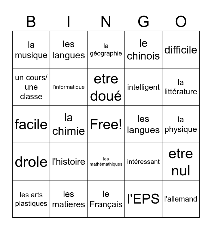 This bingo card has a free space and 29 words: les arts plastiques, la biologie, la chimie, les sciences, la musique, la géographie, l'informatique, l'histoire, les langues, les matieres, la physique, l'allemand, le Français, l'EPS, la littérature, l'espagnol, les mathémathiques, drole, difficile, facile, intéressant, énergique, intelligent, un cours/ une classe, le chinois, les langues, etre nul, etre doué and l"algébra.