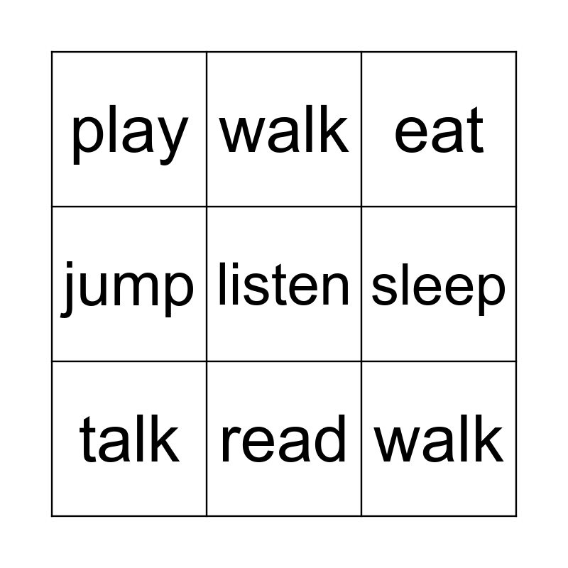 This bingo card has a free space and 19 words: jump, run, eat, drink, sleep, walk, talk, play, walk, run, drink, sleep, talk, play, eat, listen, jump, read and open.