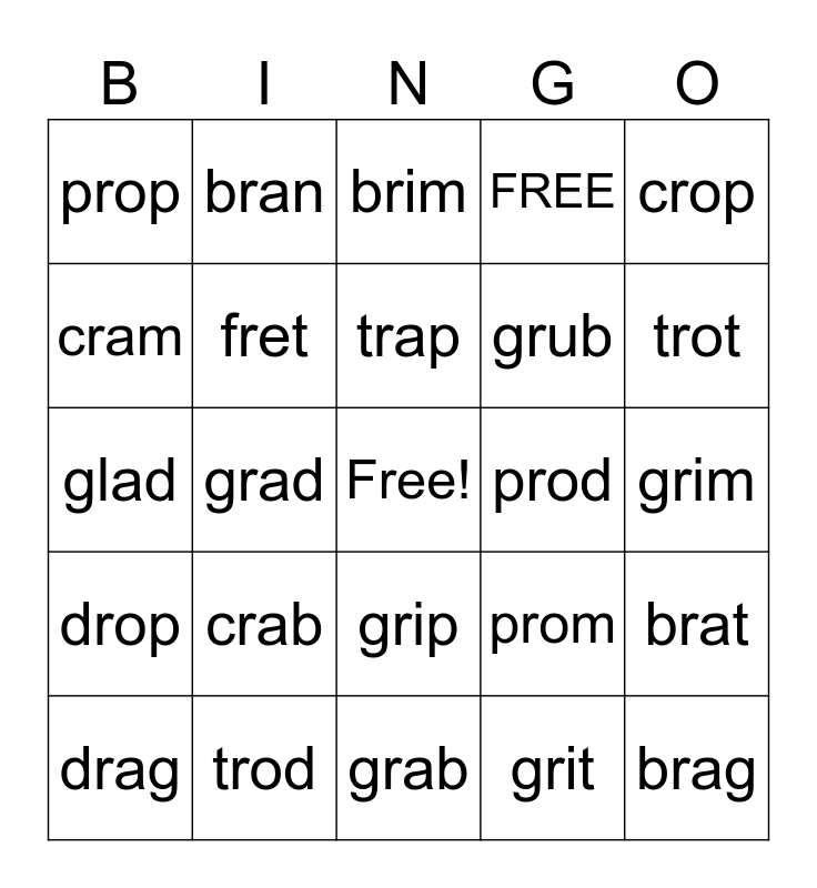 This bingo card has a free space and 25 words: crab, grab, trap, drag, crop, prop, cram, bran, prod, grip, grub, glad, prom, brat, fret, trip, grim, brim, trot, grad, brag, trod, drop, FREE and grit.