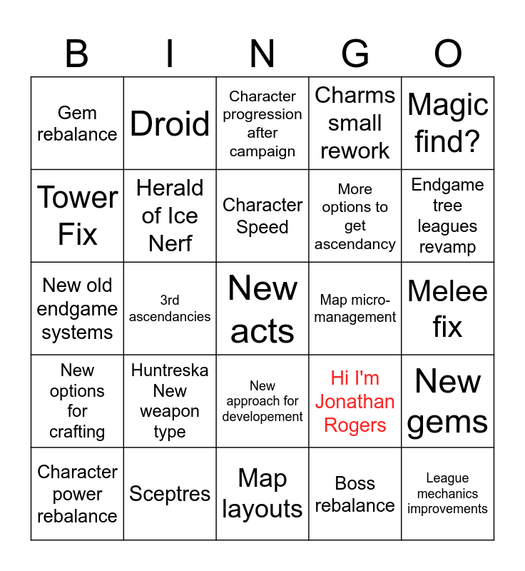 This bingo card has 25 words: Huntreska New weapon type, Map layouts, Character Speed, Character power rebalance, Magic find?, Gem rebalance, Tower Fix, Droid, Map micro-management, New approach for developement, More options to get ascendancy, New old endgame systems, Hi I'm Jonathan Rogers, New gems, Herald of Ice Nerf, League mechanics improvements, Melee fix, Character progression after campaign, Endgame tree leagues revamp, 3rd ascendancies, New acts, Sceptres, New options for crafting, Charms small rework and Boss rebalance.