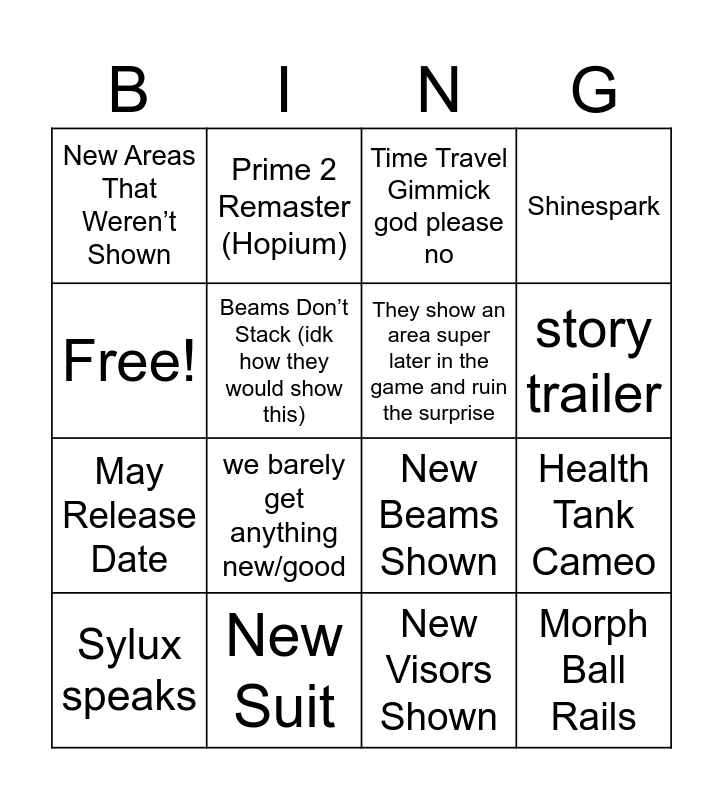 This bingo card has 16 words: New Suit, Health Tank Cameo, Time Travel Gimmick god please no, New Areas That Weren’t Shown, May Release Date, Prime 2 Remaster (Hopium), New Beams Shown, New Visors Shown, Free!, Beams Don’t Stack (idk how they would show this), Sylux speaks, Shinespark, we barely get anything new/good, story trailer, They show an area super later in the game and ruin the surprise and Morph Ball Rails.