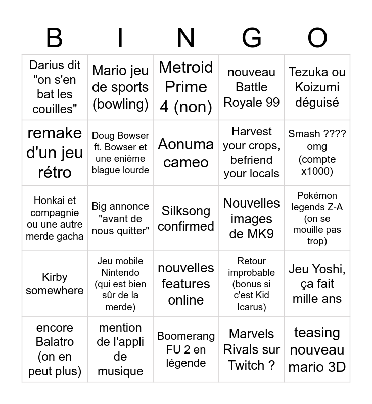 This bingo card has a free space and 24 words: Jeu mobile Nintendo (qui est bien sûr de la merde), mention de l'appli de musique, Aonuma cameo, encore Balatro (on en peut plus), Tezuka ou Koizumi déguisé, Darius dit "on s'en bat les couilles", remake d'un jeu rétro, Mario jeu de sports (bowling), Nouvelles images de MK9, nouvelles features online, Harvest your crops, befriend your locals, Honkai et compagnie ou une autre merde gacha, Retour improbable (bonus si c'est Kid Icarus), Jeu Yoshi, ça fait mille ans, Doug Bowser ft. Bowser et une enième blague lourde, Marvels Rivals sur Twitch ?, Pokémon legends Z-A (on se mouille pas trop), Metroid Prime 4 (non), Smash ???? omg (compte x1000), Big annonce "avant de nous quitter", teasing nouveau mario 3D, Kirby somewhere, nouveau Battle Royale 99 and Boomerang FU 2 en légende.