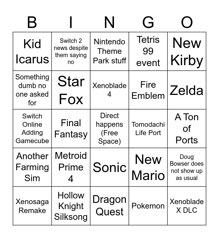 This bingo card has a free space and 24 words: Metroid Prime 4, Hollow Knight Silksong, Xenoblade 4, Xenosaga Remake, New Kirby, Kid Icarus, Something dumb no one asked for, Switch 2 news despite them saying no, Tomodachi Life Port, Sonic, Fire Emblem, Switch Online Adding Gamecube, New Mario, Doug Bowser does not show up as usual, Star Fox, Pokemon, A Ton of Ports, Nintendo Theme Park stuff, Zelda, Final Fantasy, Xenoblade X DLC, Another Farming Sim, Tetris 99 event and Dragon Quest.