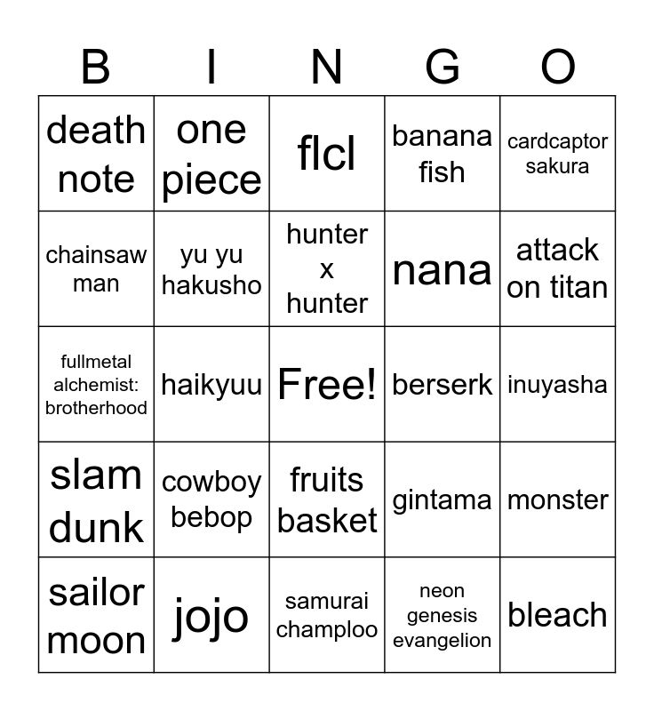 This bingo card has a free space and 24 words: sailor moon, cowboy bebop, hunter x hunter, neon genesis evangelion, cardcaptor sakura, death note, one piece, flcl, berserk, inuyasha, fullmetal alchemist: brotherhood, yu yu hakusho, gintama, monster, chainsaw man, jojo, samurai champloo, banana fish, attack on titan, slam dunk, haikyuu, fruits basket, nana and bleach.