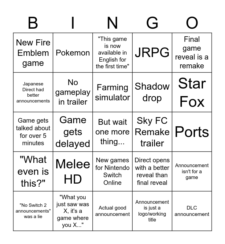 This bingo card has a free space and 24 words: Melee HD, "What you just saw was X, it's a game where you X...", Farming simulator, "No Switch 2 announcements" was a lie, Final game reveal is a remake, New Fire Emblem game, Japanese Direct had better announcements, Pokemon, Sky FC Remake trailer, New games for Nintendo Switch Online, Shadow drop, Game gets talked about for over 5 minutes, Direct opens with a better reveal than final reveal, Announcement isn't for a game, No gameplay in trailer, Announcement is just a logo/working title, Ports, "This game is now available in English for the first time", Star Fox, Game gets delayed, DLC announcement, "What even is this?", JRPG and Actual good announcement.