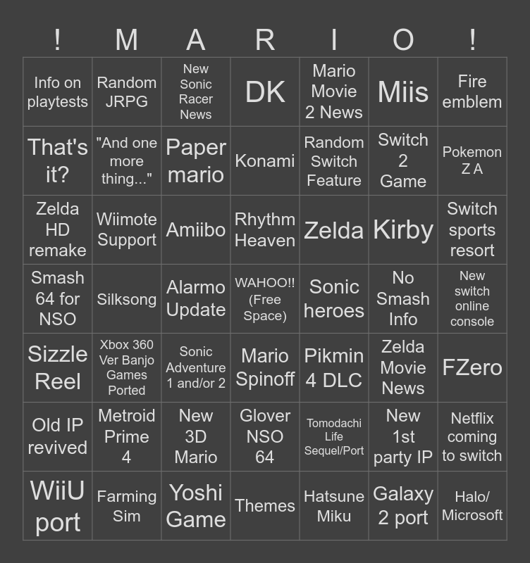 This bingo card has a free space and 48 words: Tomodachi Life Sequel/Port, Switch 2 Game, Themes, Silksong, Amiibo, New switch online console, Random JRPG, Farming Sim, Miis, Mario Spinoff, Fire emblem, DK, Kirby, Zelda, Old IP revived, No Smash Info, That's it?, Pokemon Z A, New 1st party IP, Mario Movie 2 News, Random Switch Feature, Alarmo Update, Info on playtests, "And one more thing...", Netflix coming to switch, Paper mario, Switch sports resort, WiiU port, Rhythm Heaven, Wiimote Support, Galaxy 2 port, Sonic heroes, FZero, Metroid Prime 4, Smash 64 for NSO, Pikmin 4 DLC, Zelda Movie News, Zelda HD remake, Sonic Adventure 1 and/or 2, New 3D Mario, Sizzle Reel, Halo/ Microsoft, New Sonic Racer News, Yoshi Game, Konami, Glover NSO 64, Xbox 360 Ver Banjo Games Ported and Hatsune Miku.