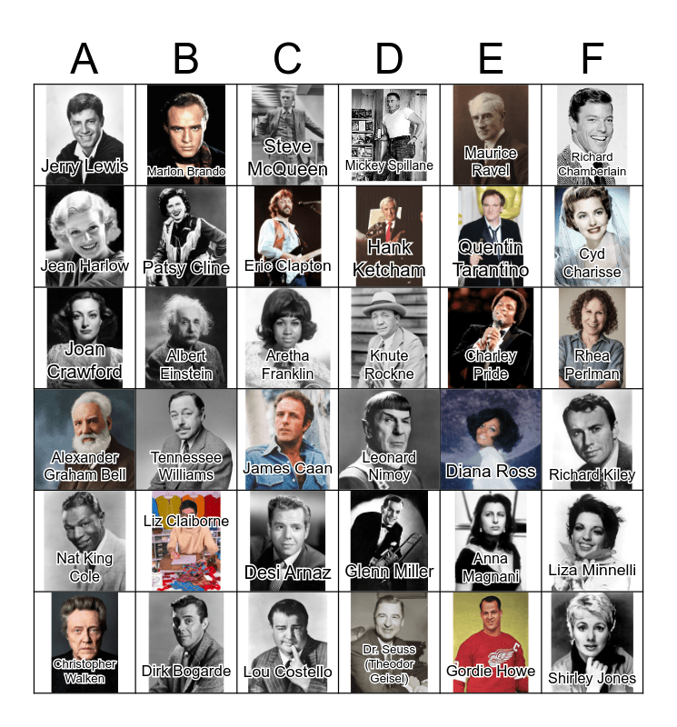 This bingo card has 36 images and 36 words: Glenn Miller, Desi Arnaz, Dr. Seuss (Theodor Geisel), Jean Harlow, Alexander Graham Bell, Knute Rockne, Patsy Cline, Lou Costello, Maurice Ravel, Anna Magnani, Cyd Charisse, Mickey Spillane, Liza Minnelli, Albert Einstein, Hank Ketcham, Jerry Lewis, Nat King Cole, Charley Pride, Joan Crawford, Steve McQueen, Aretha Franklin, Tennessee Williams, Leonard Nimoy, James Caan, Diana Ross, Marlon Brando, Quentin Tarantino, Dirk Bogarde, Eric Clapton, Richard Chamberlain, Shirley Jones, Christopher Walken, Richard Kiley, Rhea Perlman, Liz Claiborne and Gordie Howe.