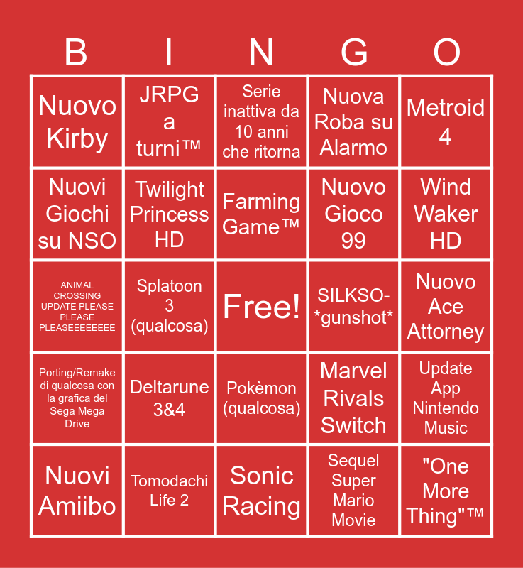 This bingo card has a free space and 24 words: Deltarune 3&4, Tomodachi Life 2, Farming Game™, Nuovi Amiibo, Metroid 4, Nuovo Kirby, Nuovi Giochi su NSO, JRPG a turni™, SILKSO-*gunshot*, Pokèmon (qualcosa), Nuovo Gioco 99, ANIMAL CROSSING UPDATE PLEASE PLEASE PLEASEEEEEEEE, Marvel Rivals Switch, Update App Nintendo Music, Twilight Princess HD, Sequel Super Mario Movie, Nuovo Ace Attorney, Serie inattiva da 10 anni che ritorna, Wind Waker HD, Splatoon 3 (qualcosa), "One More Thing"™, Porting/Remake di qualcosa con la grafica del Sega Mega Drive, Nuova Roba su Alarmo and Sonic Racing.