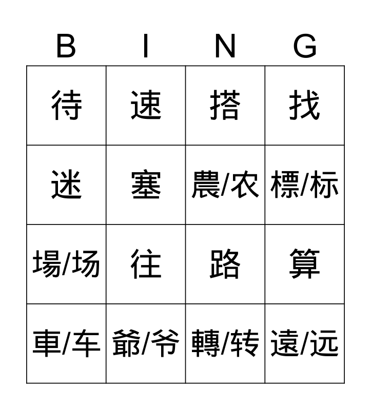 This bingo card has 16 words: 爺/爷, 算, 搭, 待, 場/场, 速, 路, 轉/转, 迷, 塞, 車/车, 找, 往, 標/标, 農/农 and 遠/远.