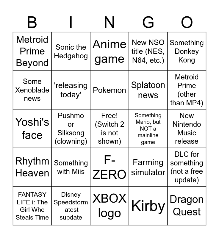 This bingo card has a free space and 24 words: Something with Miis, Disney Speedstorm latest supdate, Pokemon, FANTASY LIFE i: The Girl Who Steals Time, Something Donkey Kong, Metroid Prime Beyond, Some Xenoblade news, Sonic the Hedgehog, Something Mario, but NOT a mainline game, F-ZERO, Splatoon news, Yoshi's face, Farming simulator, DLC for something (not a free update), 'releasing today', Kirby, New Nintendo Music release, Anime game, Metroid Prime (other than MP4), Pushmo or Silksong (clowning), Dragon Quest, Rhythm Heaven, New NSO title (NES, N64, etc.) and XBOX logo.