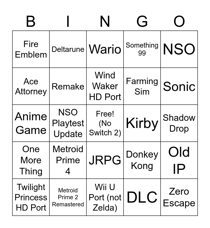 This bingo card has a free space and 24 words: Metroid Prime 4, Metroid Prime 2 Remastered, Wind Waker HD Port, Twilight Princess HD Port, NSO, Fire Emblem, Ace Attorney, Deltarune, Kirby, JRPG, Farming Sim, Anime Game, Donkey Kong, Old IP, Remake, DLC, Shadow Drop, Wario, Sonic, NSO Playtest Update, Zero Escape, One More Thing, Something 99 and Wii U Port (not Zelda).