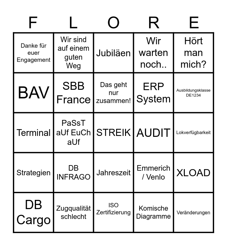 This bingo card has a free space and 24 words: DB INFRAGO, Zugqualität schlecht, Das geht nur zusammen!, DB Cargo, Hört man mich?, Danke für euer Engagement, BAV, Wir sind auf einem guten Weg, AUDIT, Jahreszeit, ERP System, Terminal, Emmerich / Venlo, XLOAD, SBB France, Komische Diagramme, Lokverfügbarkeit, Jubiläen, Ausbildungsklasse DE1234, PaSsT aUf EuCh aUf, Veränderungen, Strategien, Wir warten noch.. and ISO Zertifizierung.