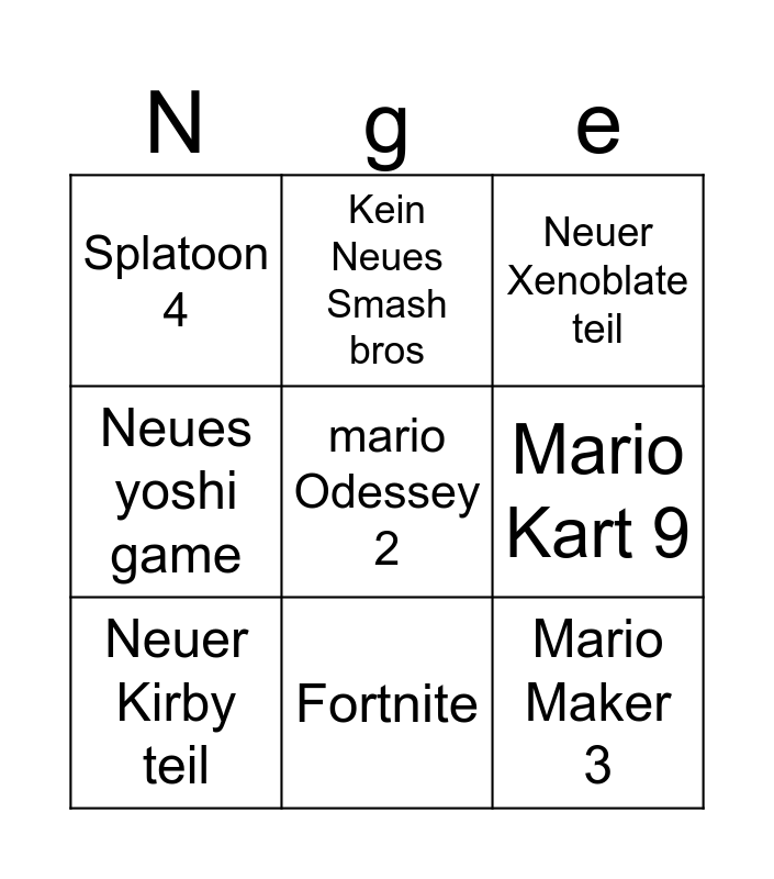 This bingo card has a free space and 8 words: Mario Kart 9, Neuer Xenoblate teil, Kein Neues Smash bros, Neuer Kirby teil, Splatoon 4, Mario Maker 3, Neues yoshi game and Fortnite.