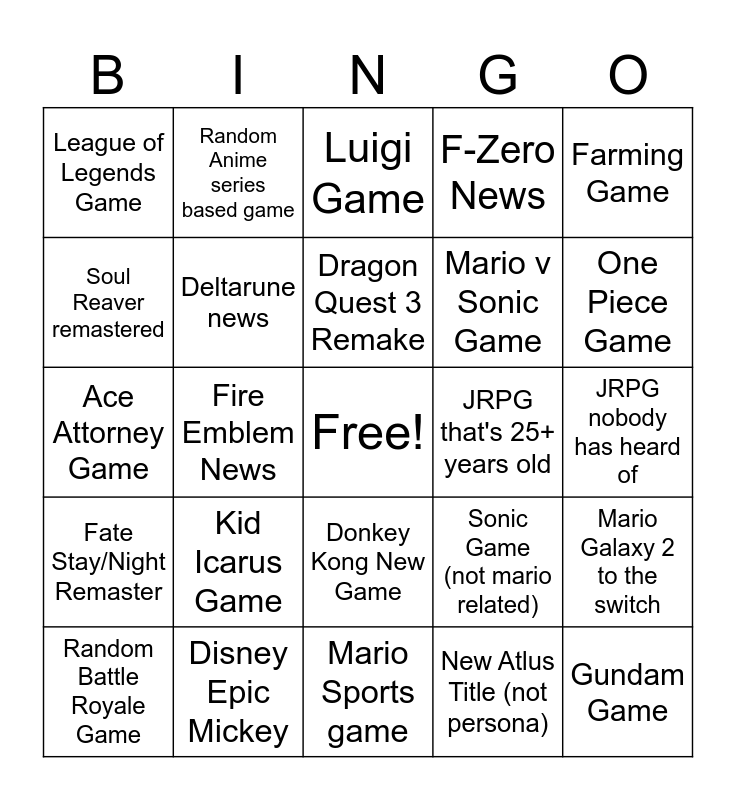 This bingo card has a free space and 41 words: 2D side scrolling adventure, Ace Attorney Game, Capcom v Marvel, Deltarune news, Disney Epic Mickey, Donkey Kong New Game, Dragon Quest 3 Remake, Fantasy Life, Farming Game, Fate Stay/Night Remaster, Fire Emblem News, F-Zero News, Gundam Game, JRPG nobody has heard of, JRPG that's 25+ years old, Kid Icarus Game, Kirby Game, League of Legends Game, Lego Game, Luigi Game, Mario Galaxy 2 to the switch, Mario Party news, Mario Sports game, Mario v Sonic Game, Metroid Prime 4, New Amiibo revealed, New Atlus Title (not persona), Non-MarioKart Racing Game, One Piece Game, Pac man news, Pikmin DLC, Random Anime series based game, Random Battle Royale Game, Rhythm Game, Sonic Game (not mario related), Soul Reaver remastered, Splatoon 3 News, Twilight Princess Remake, Waluigi sighting, Wario Game and Wind Waker Remake.