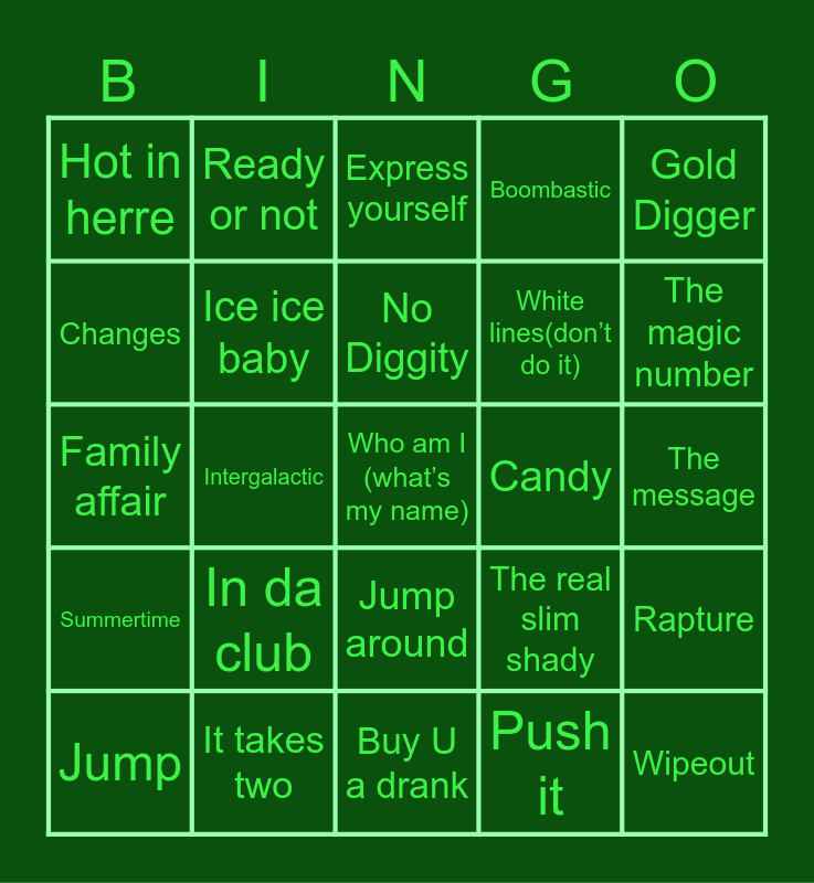 This bingo card has 35 words: Stronger, Rappers delight, Lose yourself, Ice ice baby, Jump around, Boombastic, Changes, Return of the Mack, No Diggity, Empire State Of Mind, Family affair, Gold Digger, Gangsters Paradise, Candy shop, Hot in herre, Candy, Push it, Intergalactic, Summertime, Who am I (what’s my name), The real slim shady, Jump, Rapture, It takes two, Express yourself, The magic number, Wipeout, Bust a move, White lines(don’t do it), The message, It’s tricky, Buy U a drank, In da club, Ready or not and 21 seconds.