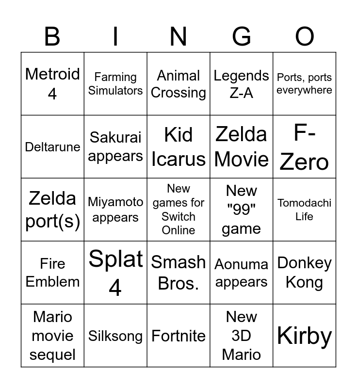 This bingo card has a free space and 24 words: Splat 4, Silksong, Kid Icarus, Mario movie sequel, Ports, ports everywhere, Metroid 4, Deltarune, Farming Simulators, New "99" game, Smash Bros., Zelda Movie, Zelda port(s), Aonuma appears, Donkey Kong, Sakurai appears, New 3D Mario, Tomodachi Life, Animal Crossing, F-Zero, Miyamoto appears, Kirby, Fire Emblem, Legends Z-A and Fortnite.