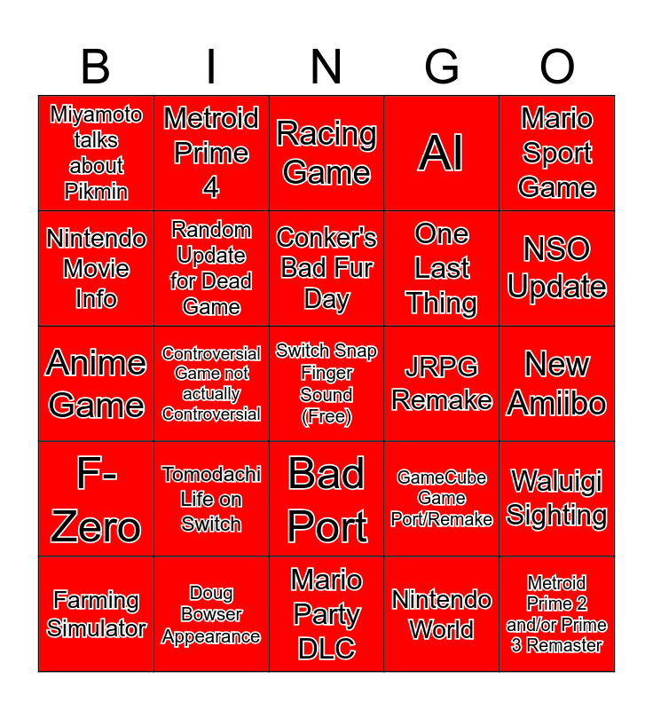 This bingo card has a free space and 24 words: Tomodachi Life on Switch, Doug Bowser Appearance, Conker's Bad Fur Day, Farming Simulator, Mario Sport Game, Miyamoto talks about Pikmin, Nintendo Movie Info, Metroid Prime 4, JRPG Remake, Bad Port, One Last Thing, Anime Game, GameCube Game Port/Remake, Waluigi Sighting, Random Update for Dead Game, Nintendo World, New Amiibo, Racing Game, NSO Update, Controversial Game not actually Controversial, Metroid Prime 2 and/or Prime 3 Remaster, F-Zero, AI and Mario Party DLC.