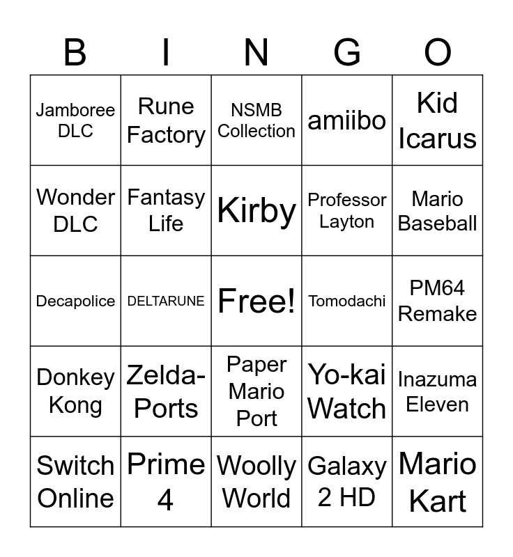 This bingo card has a free space and 24 words: Zelda-Ports, Prime 4, Kirby, Switch Online, Kid Icarus, Jamboree DLC, Wonder DLC, Rune Factory, Tomodachi, Paper Mario Port, Professor Layton, Decapolice, Yo-kai Watch, Inazuma Eleven, Fantasy Life, Galaxy 2 HD, PM64 Remake, NSMB Collection, Mario Baseball, DELTARUNE, Mario Kart, Donkey Kong, amiibo and Woolly World.