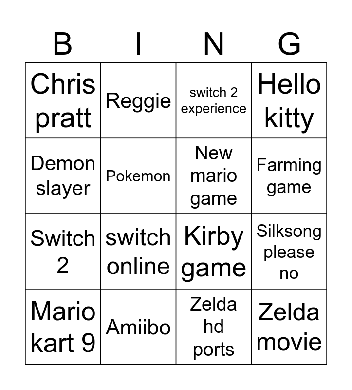 This bingo card has 17 words: Zelda hd ports, Mario kart 9, switch 2 experience, Chris pratt, switch online, Hello kitty, Silksong please no, New mario game, Farming game, Pokemon, Amiibo, Kirby game, Demon slayer, Reggie, Switch 2, Deltarune today and Zelda movie.