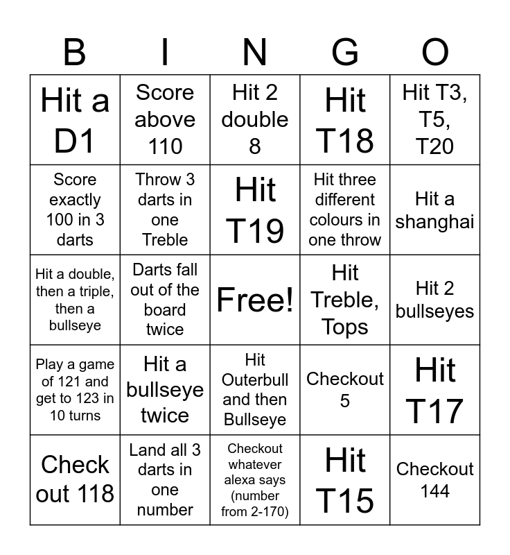 This bingo card has a free space and 24 words: Hit a bullseye twice, Land all 3 darts in one number, Hit T19, Check out 118, Hit T3, T5, T20, Hit a D1, Score exactly 100 in 3 darts, Score above 110, Hit Treble, Tops, Hit Outerbull and then Bullseye, Hit three different colours in one throw, Hit a double, then a triple, then a bullseye, Checkout 5, Hit T17, Throw 3 darts in one Treble, Hit T15, Hit 2 bullseyes, Hit 2 double 8, Hit a shanghai, Darts fall out of the board twice, Checkout 144, Play a game of 121 and get to 123 in 10 turns, Hit T18 and Checkout whatever alexa says (number from 2-170).