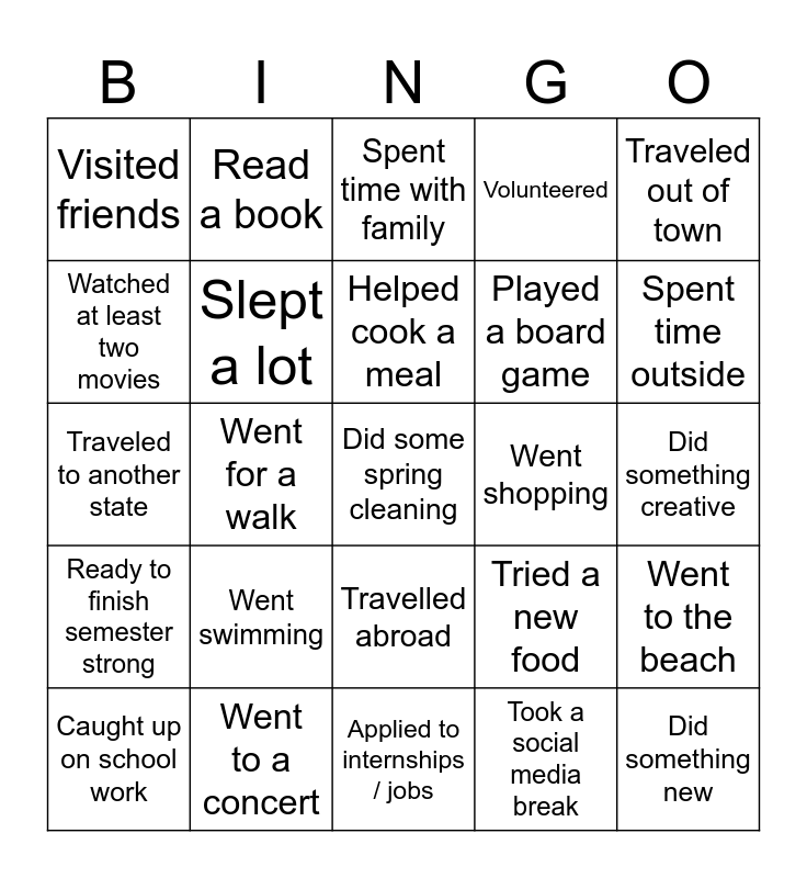 This bingo card has 25 words: Went swimming, Applied to internships / jobs, Helped cook a meal, Caught up on school work, Traveled out of town, Visited friends, Watched at least two movies, Read a book, Went shopping, Travelled abroad, Played a board game, Traveled to another state, Tried a new food, Went to the beach, Slept a lot, Did something new, Did something creative, Spent time with family, Spent time outside, Went for a walk, Did some spring cleaning, Went to a concert, Ready to finish semester strong, Volunteered and Took a social media break.