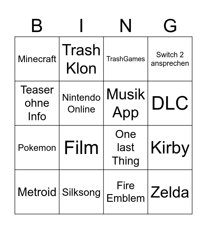 This bingo card has 16 words: Silksong, Kirby, TrashGames, Minecraft, Pokemon, Trash Klon, One last Thing, Fire Emblem, Teaser ohne Info, Nintendo Online, Metroid, Switch 2 ansprechen, Film, DLC, Musik App and Zelda.