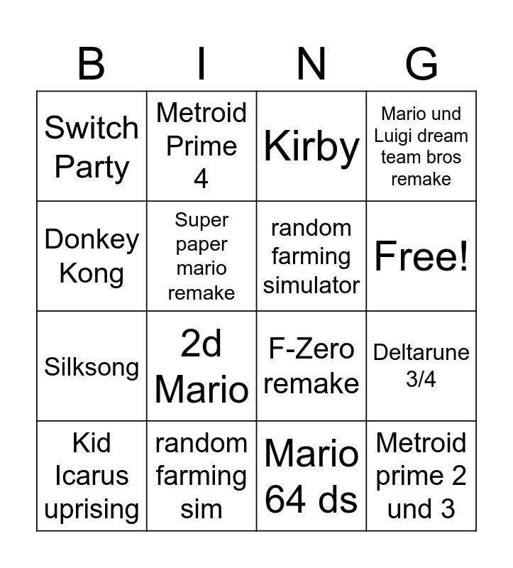 This bingo card has 18 words: 2d Mario, Metroid prime 2 und 3, Kirby, Switch Party, F-Zero remake, Mario und Luigi dream team bros remake, Kid Icarus uprising, Metroid Prime 4, Free!, Silksong, Mario 64 ds, Donkey Kong, Deltarune 3/4, Super paper mario remake, random farming simulator, Tomodachi Life 2/Hd, random farming sim and Tomodachi Life HD/2.