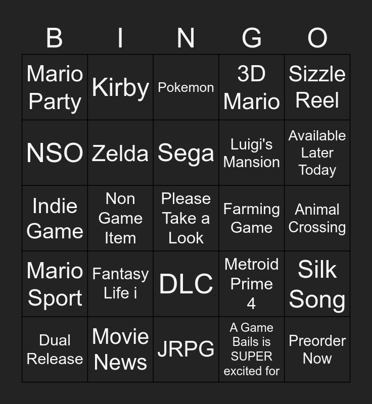 This bingo card has a free space and 24 words: Fantasy Life i, Movie News, Sega, Dual Release, Sizzle Reel, Mario Party, NSO, Kirby, Farming Game, DLC, Luigi's Mansion, Indie Game, Metroid Prime 4, Silk Song, Zelda, A Game Bails is SUPER excited for, Animal Crossing, Pokemon, Available Later Today, Non Game Item, Preorder Now, Mario Sport, 3D Mario and JRPG.