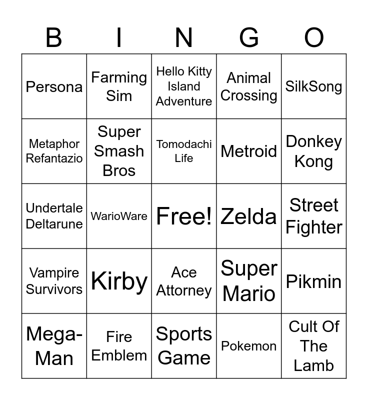 This bingo card has a free space and 24 words: Kirby, Fire Emblem, Tomodachi Life, Mega-Man, SilkSong, Persona, Metaphor Refantazio, Farming Sim, Zelda, Ace Attorney, Metroid, Undertale Deltarune, Super Mario, Pikmin, Super Smash Bros, Pokemon, Street Fighter, Hello Kitty Island Adventure, Donkey Kong, WarioWare, Cult Of The Lamb, Vampire Survivors, Animal Crossing and Sports Game.