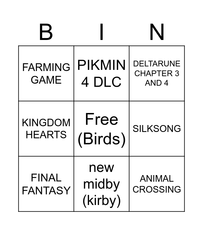This bingo card has a free space and 8 words: SILKSONG, DELTARUNE CHAPTER 3 AND 4, PIKMIN 4 DLC, FINAL FANTASY, FARMING GAME, ANIMAL CROSSING, KINGDOM HEARTS and new midby (kirby).