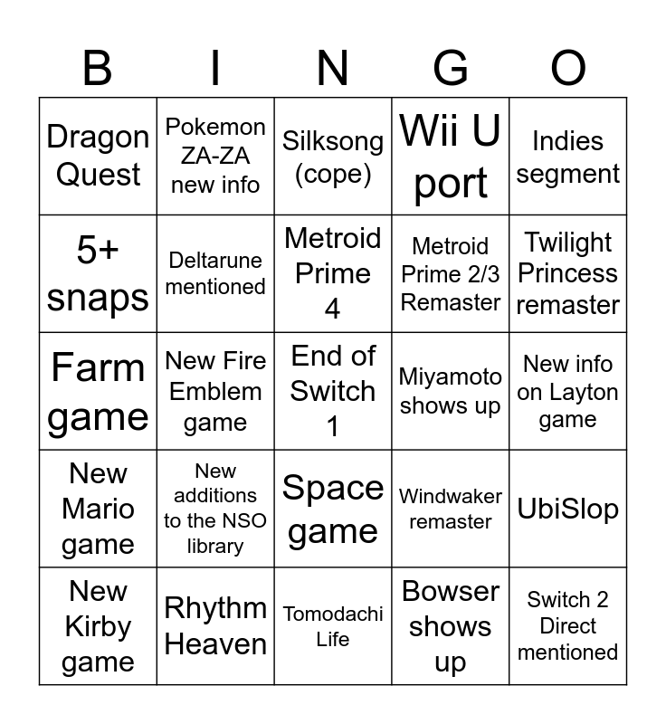 This bingo card has a free space and 24 words: New additions to the NSO library, Rhythm Heaven, Metroid Prime 4, New Kirby game, Indies segment, Dragon Quest, 5+ snaps, Pokemon ZA-ZA new info, Miyamoto shows up, Space game, Metroid Prime 2/3 Remaster, Farm game, Windwaker remaster, UbiSlop, Deltarune mentioned, Bowser shows up, New info on Layton game, Silksong (cope), Twilight Princess remaster, New Fire Emblem game, Switch 2 Direct mentioned, New Mario game, Wii U port and Tomodachi Life.