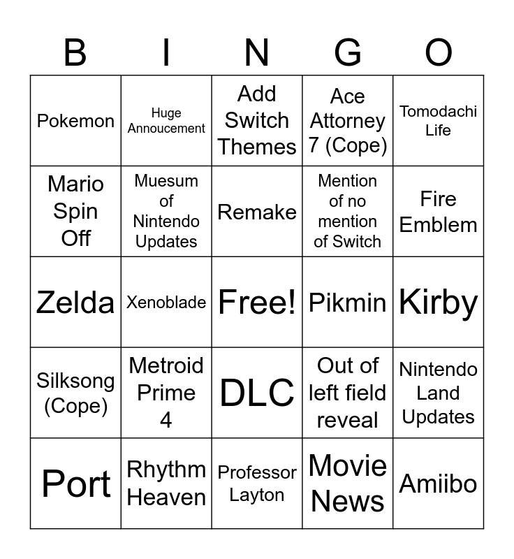 This bingo card has a free space and 24 words: Metroid Prime 4, Rhythm Heaven, Remake, Port, Tomodachi Life, Pokemon, Mario Spin Off, Huge Annoucement, Pikmin, DLC, Mention of no mention of Switch, Zelda, Out of left field reveal, Nintendo Land Updates, Muesum of Nintendo Updates, Movie News, Kirby, Add Switch Themes, Fire Emblem, Xenoblade, Amiibo, Silksong (Cope), Ace Attorney 7 (Cope) and Professor Layton.