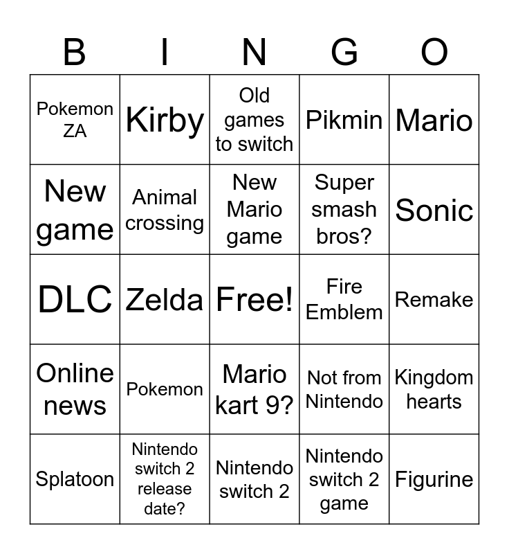 This bingo card has a free space and 24 words: Pokemon, Nintendo switch 2 release date?, New Mario game, Splatoon, Mario, Pokemon ZA, New game, Kirby, Fire Emblem, Mario kart 9?, Super smash bros?, DLC, Not from Nintendo, Kingdom hearts, Animal crossing, Nintendo switch 2 game, Remake, Old games to switch, Sonic, Zelda, Figurine, Online news, Pikmin and Nintendo switch 2.
