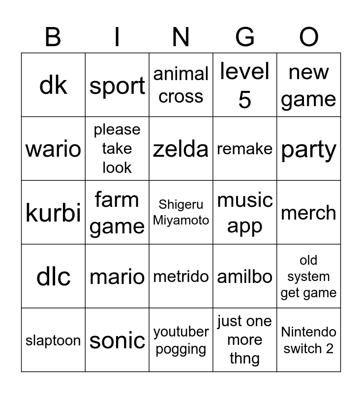 This bingo card has a free space and 24 words: mario, sonic, zelda, slaptoon, new game, dk, wario, sport, music app, metrido, remake, kurbi, amilbo, old system get game, please take look, just one more thng, merch, animal cross, party, farm game, Nintendo switch 2, dlc, level 5 and youtuber pogging.